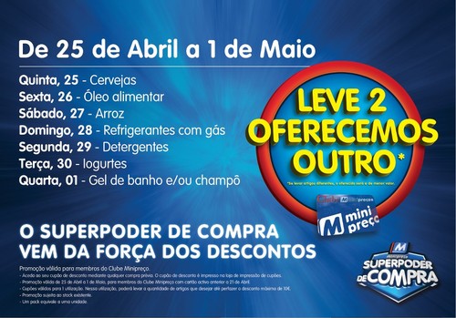 O Mini-Preço começou em grande e de hoje, 25 de Abril a 1 de Maio vai ter vários produtos em promoção com L3P2, serão várias categorias de produtos onde estão incluídas todas as marcas, como já coloquei ontem no facebook.