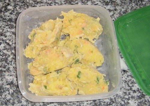 Assim, descongelei o bacalhau e preparei todo o bacalhau para fazer bacalhau com broa e cenoura, ou seja, fervi, desfiei e fiz o refogado com cebola, alho, azeite, louro e também acrescentei cenoura ralada, já é tradição e é uma boa forma de comermos legumes de forma despercebida. Ralar a cenoura e adicionar em várias comidas é uma boa forma de a dar às crianças sem que elas reclamem :) Depois juntei parte do bacalhau às batatas e couves do bacalhau com broa, podem ver aqui a receita, para perceber melhor.
