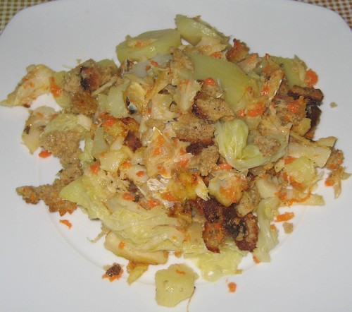 Com as batatas e a couve já cozidas, partir as batatas em rodelas finas e colocar num tabuleiro, mais ao menos metade das couve e por cima a mistura do bacalhau com a cenoura e a broa, mais uma camada de batatas e couves e outra de bacalhau e finalmente a broa picada que guardamos.